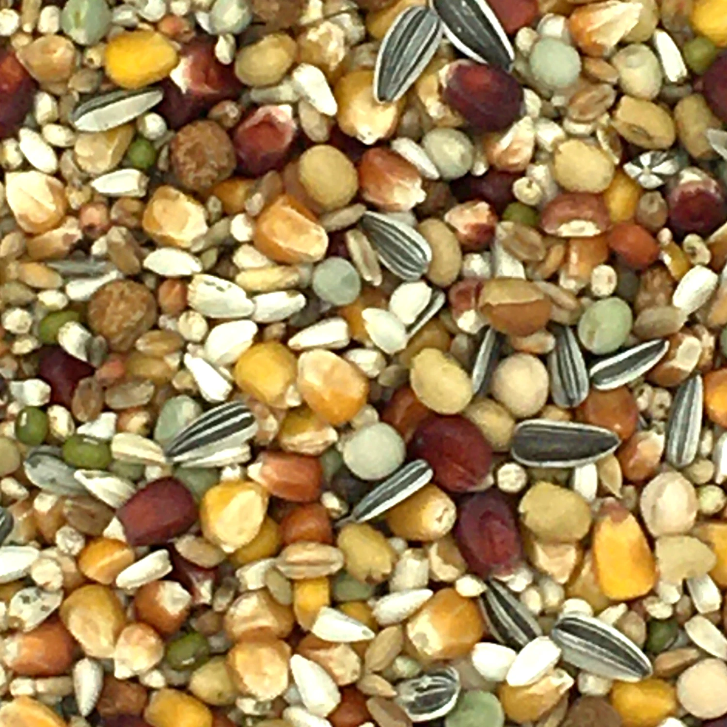 Weizen 11%, Bordeaux-Mais 10%, Cribbs-Mais 10%, Dari 10%, Merano-Mais 10%, Plata-Mais 10%, Kardi 8%, grüne Erbsen 4%, Maple Peas 4%, getoastete Soja 3%, gele Erbsen 2%, geschälte Hafer 2%, gestreifte Sonnenblumenkerne 2%, Katjang Idjoee 2%, Hanf 2%, Paddy-Reis 2%, roter Sorghum 2%, Wicken 1,5%, weiβer Millet 1,5%, gelbe Millet 1%, Raps 1%, Linsen 1%