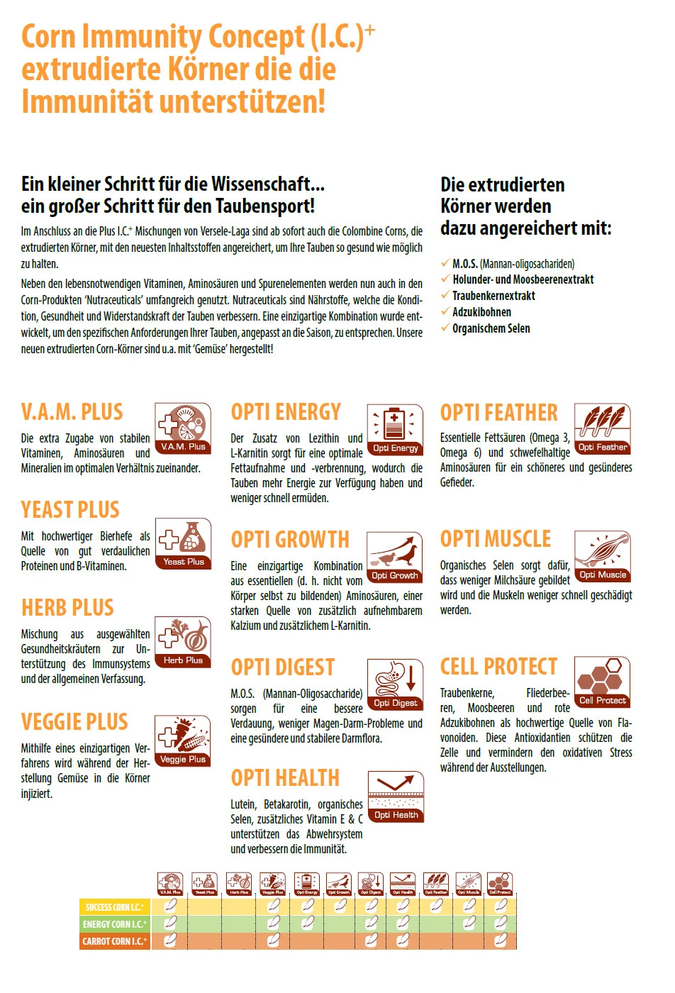 Darüber hinaus liefert Energy-Corn I.C.+ Vitamine, Mineralien und Spurenelemente. Vor allem sind Cholin, Vitamin E und Selen auf Grund ihrer muskel- und leberschützenden Funktion hoch dosiert enthalten. Während der Reisesaison ist daher eine Kombination mit einem über das Trinkwasser verabreichten Carnitin-Präparat empfehlenswert. Carnitin optimiert die Fettverbrennung während des Fluges.